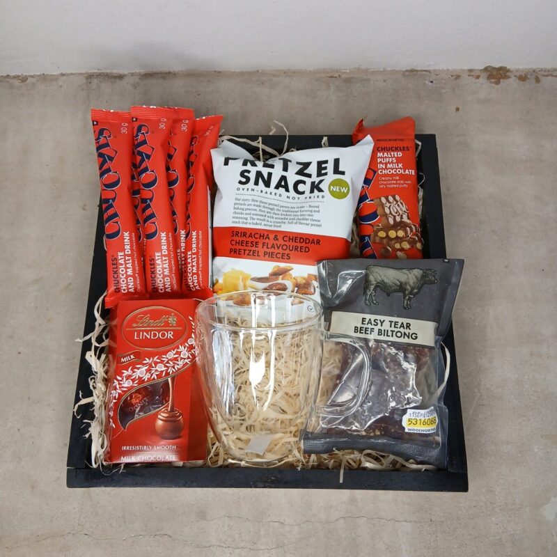 This hamper includes hot chocolate sachets, double walled mug. mixed chocolates and some savoury snacks