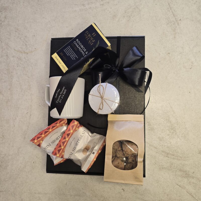 Send your condolences with a small gesture with this lovely hamper with calming tea, a candle, some biscuits, mug and rusks.